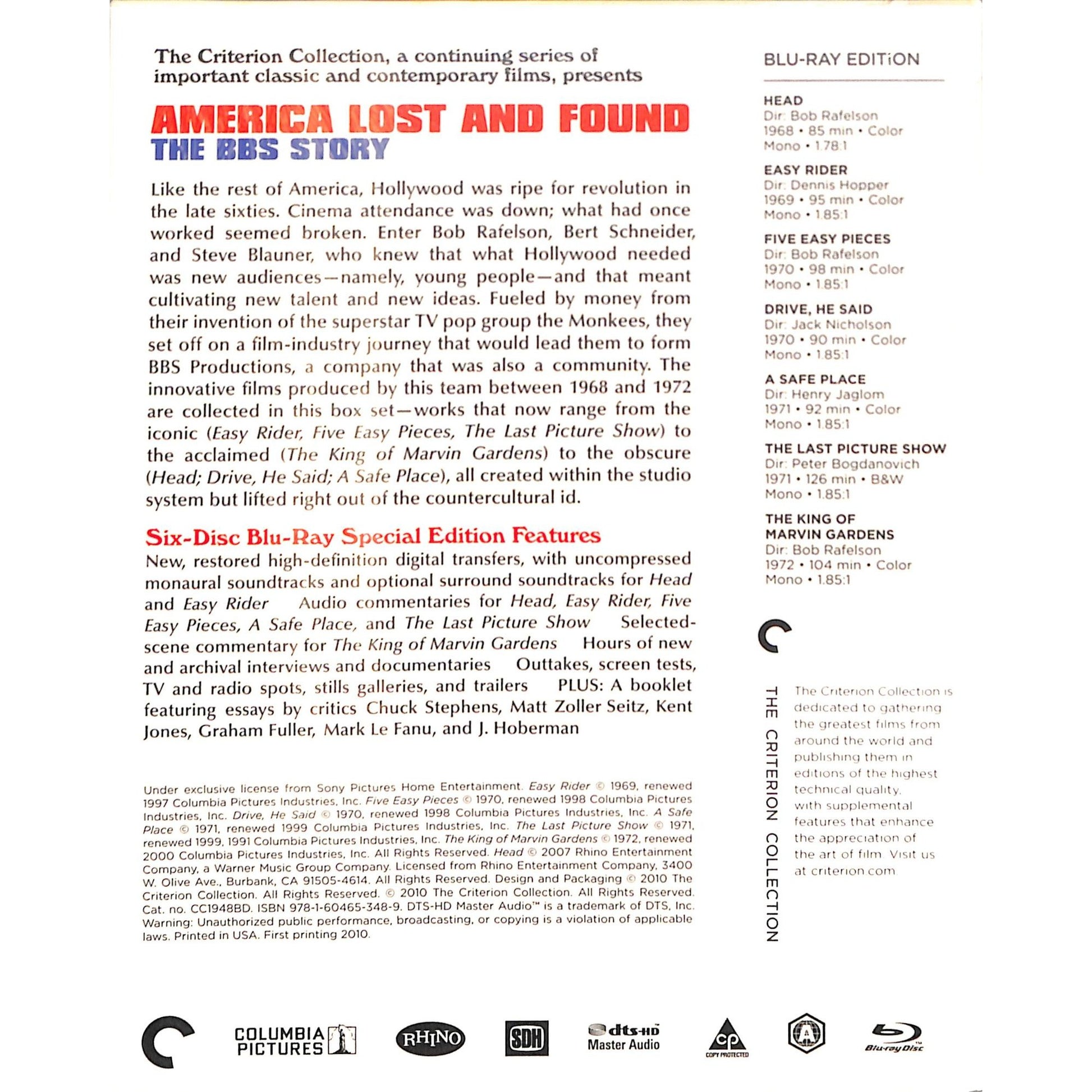 America Lost and Found: The BBS Story is a Criterion Collection box set released in 2010 that showcases seven groundbreaking films from BBS Productions, the influential company behind titles like Easy Rider, Five Easy Pieces, and The Last Picture Show. These films captured the restless, countercultural spirit of late 1960s and early 1970s America. The set also includes archival interviews, commentaries, and a documentary tracing the rise and fall of the BBS collective.