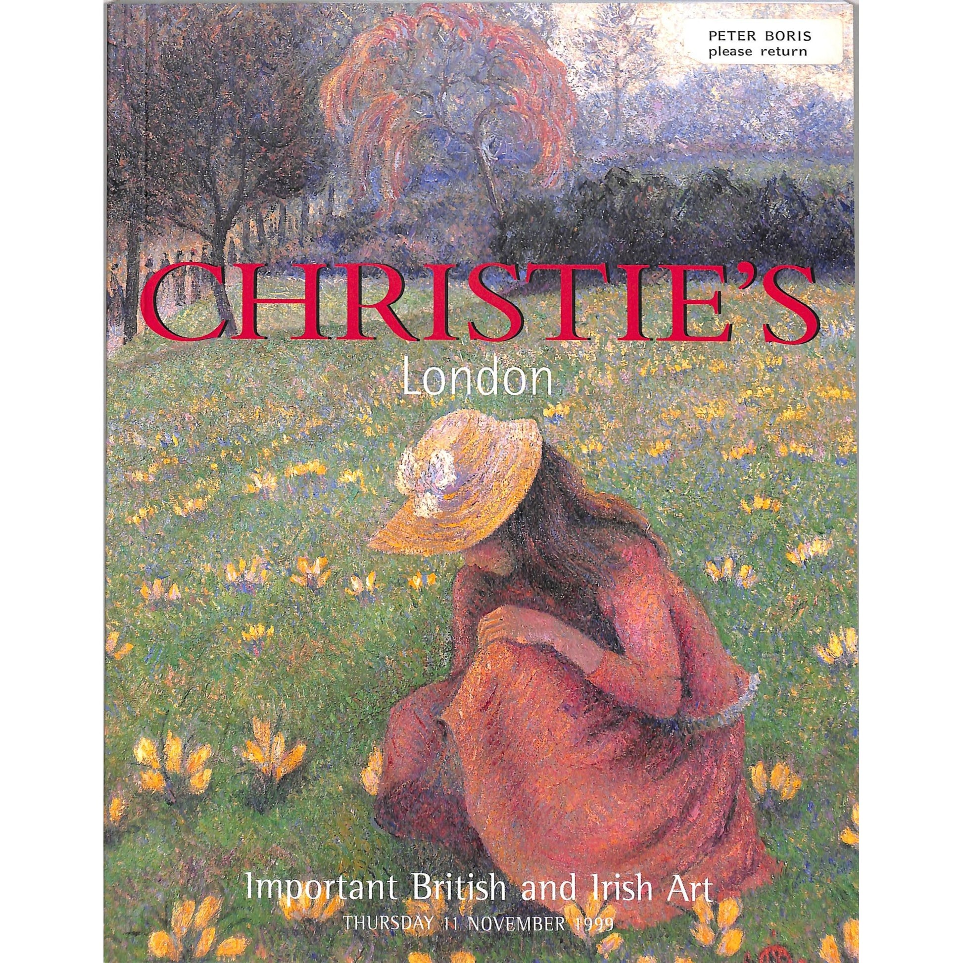Christie's auction catalog from the British and Irish Art sale on November 11, 1999. The cover features artwork with a pastoral theme and a red background with additional artwork on the back cover. The catalog details important art pieces featured in this London auction, providing insights into artist works and sale information. An item for collectors of art-related ephemera.