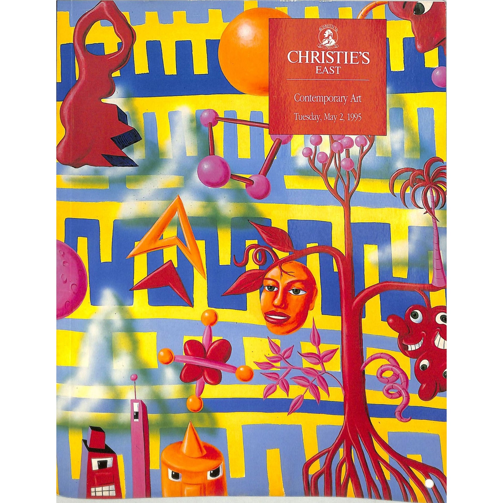 Christie's East Contemporary Art auction catalog from May 2, 1995. The catalog features a colorful cover with an abstract design and details about the auction's date and location. Published as part of Christie's renowned auctions, this catalog is a collectible reference for contemporary art enthusiasts and collectors. It presents detailed listings of lots offered during the auction.