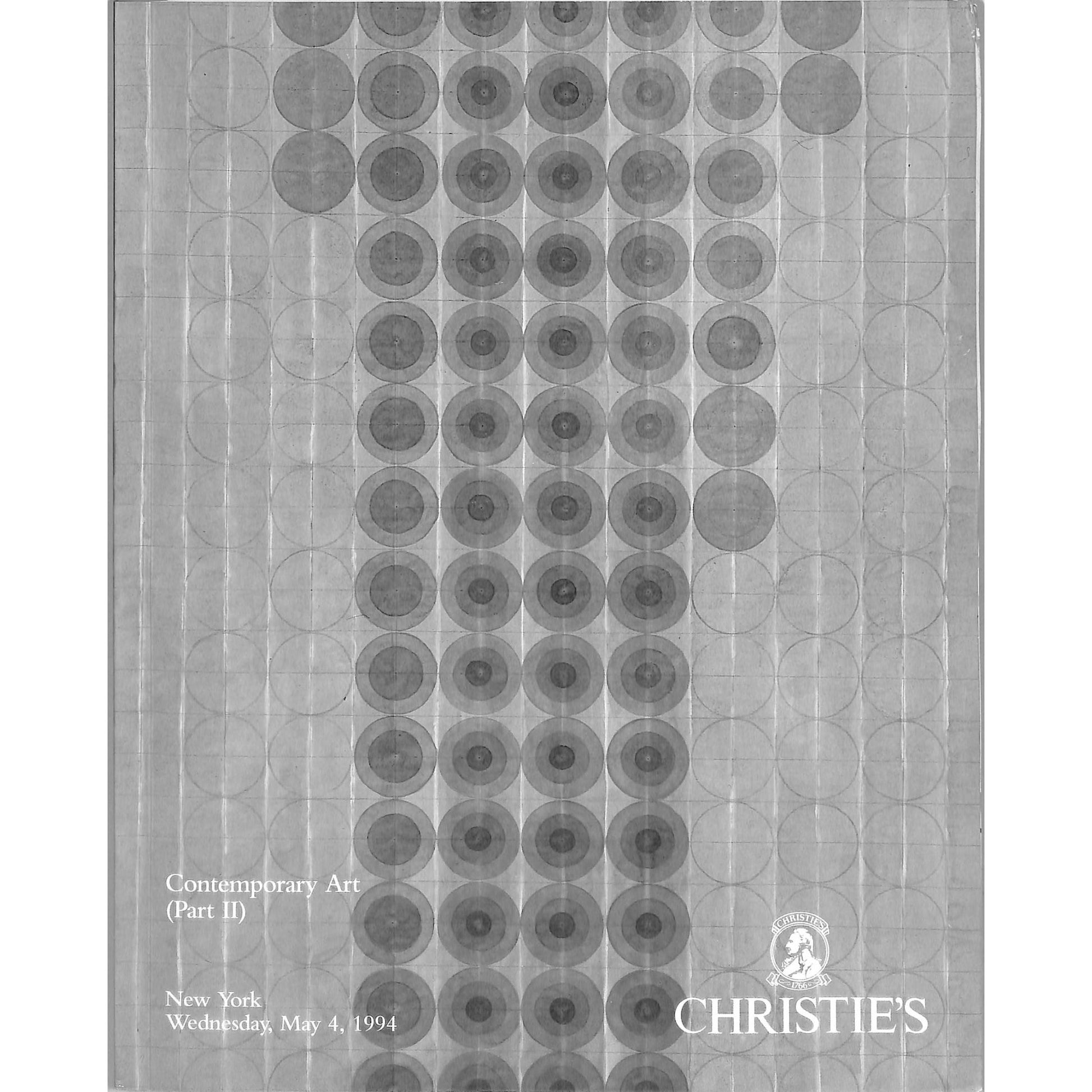 Christie's Contemporary Art (Part 2) auction catalog from May 4, 1994, hosted in New York. The catalog showcases artworks featured in the auction and includes details about the event, artists, and pieces available for bidding. Produced by Christie's, the catalog is in black and white with patterned artwork on the front cover.