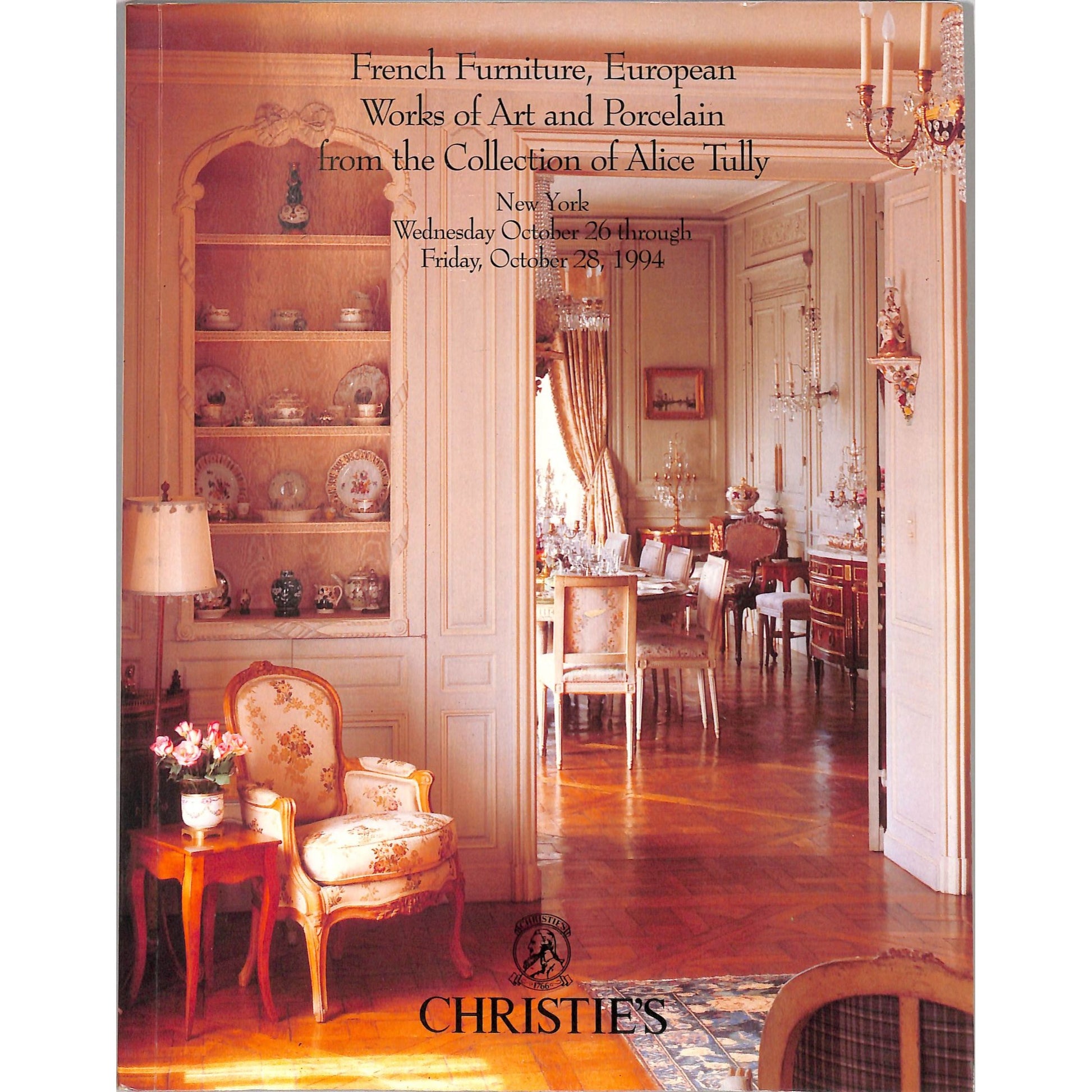 Christie's auction catalog for 'French Furniture, European Works of Art and Porcelain from the Collection of Alice Tully,' held in New York from October 26 through October 28, 1994. Featuring detailed descriptions and high-quality color images of the items offered at auction. Includes original front and back covers with decorative designs.