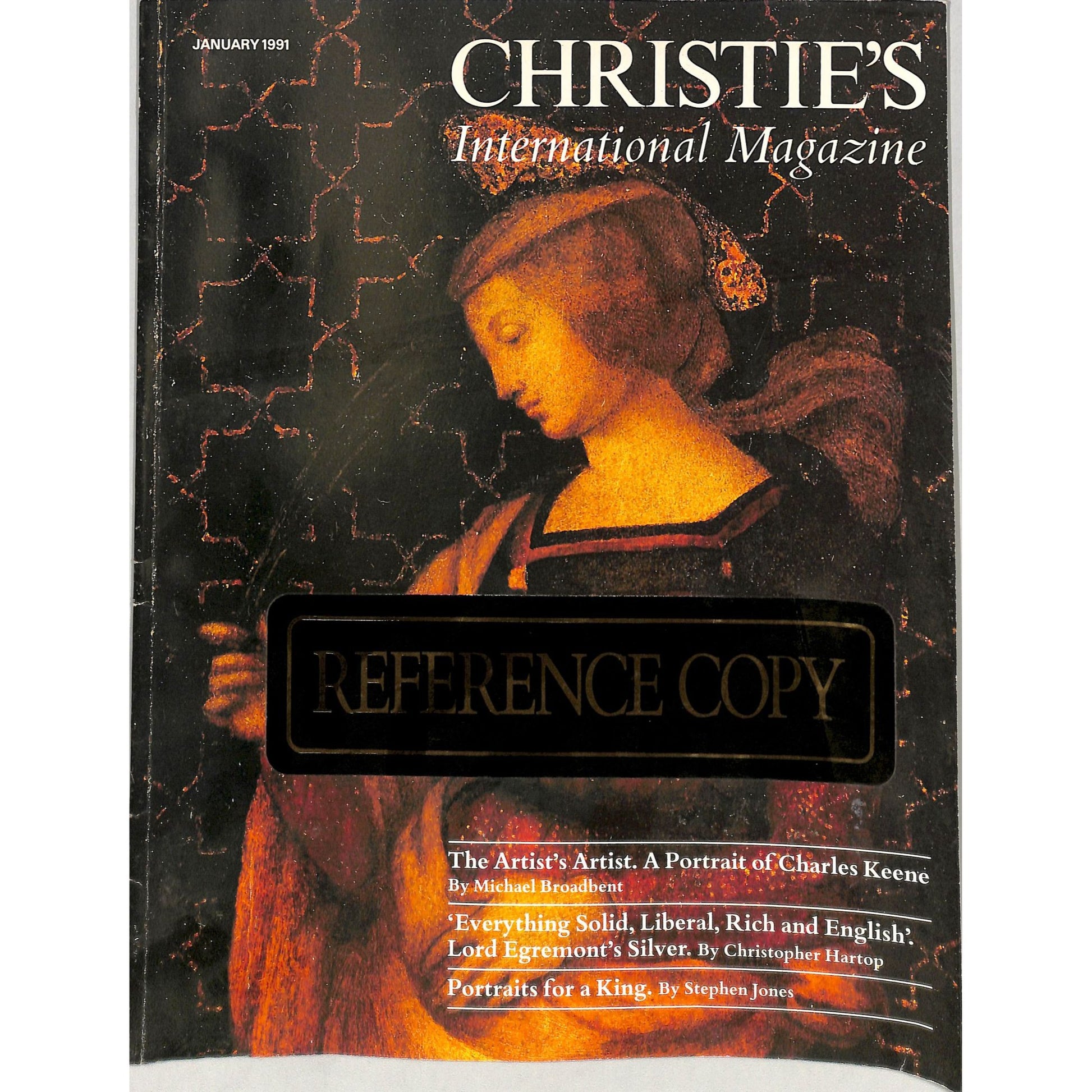 Christie’s International Magazine auction catalog from January 1991. Features articles including "The Artist’s Artist: A Portrait of Charles Keene," "Everything Solid, Liberal, Rich, and English: Lord Egremont’s Silver" by Christopher Hartop, and "Portraits for a King" by Stephen Jones. Includes artwork imagery throughout, with a total of 107 pages. Reference copy noted. Some wear evident on the cover.