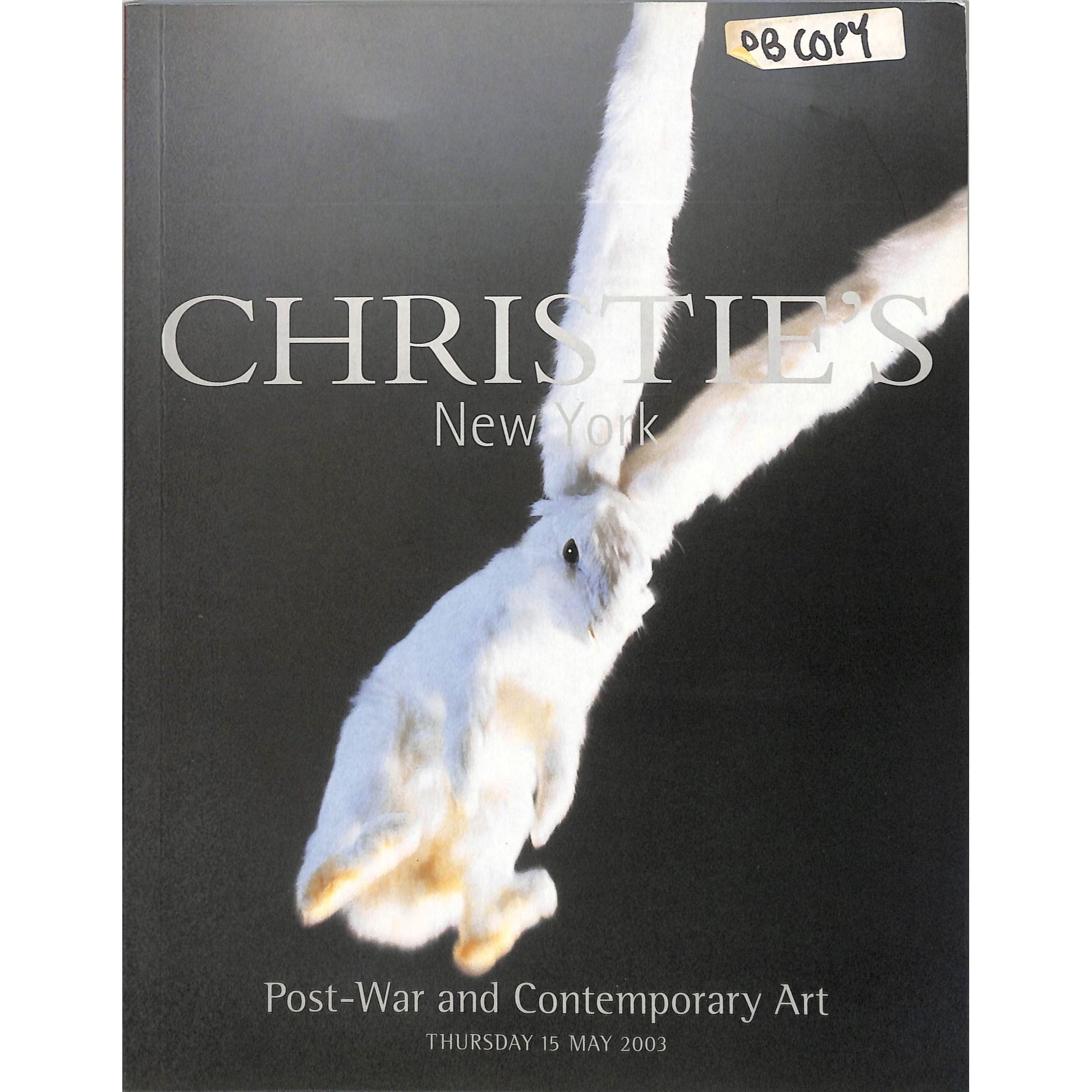 Christie's Post-War and Contemporary Art Auction catalog from May 13, 2003, held in New York. Features iconic artwork, with visually striking front and back covers. Includes auction details, artist information, and featured pieces from the event. A valuable reference for contemporary art collectors or enthusiasts.