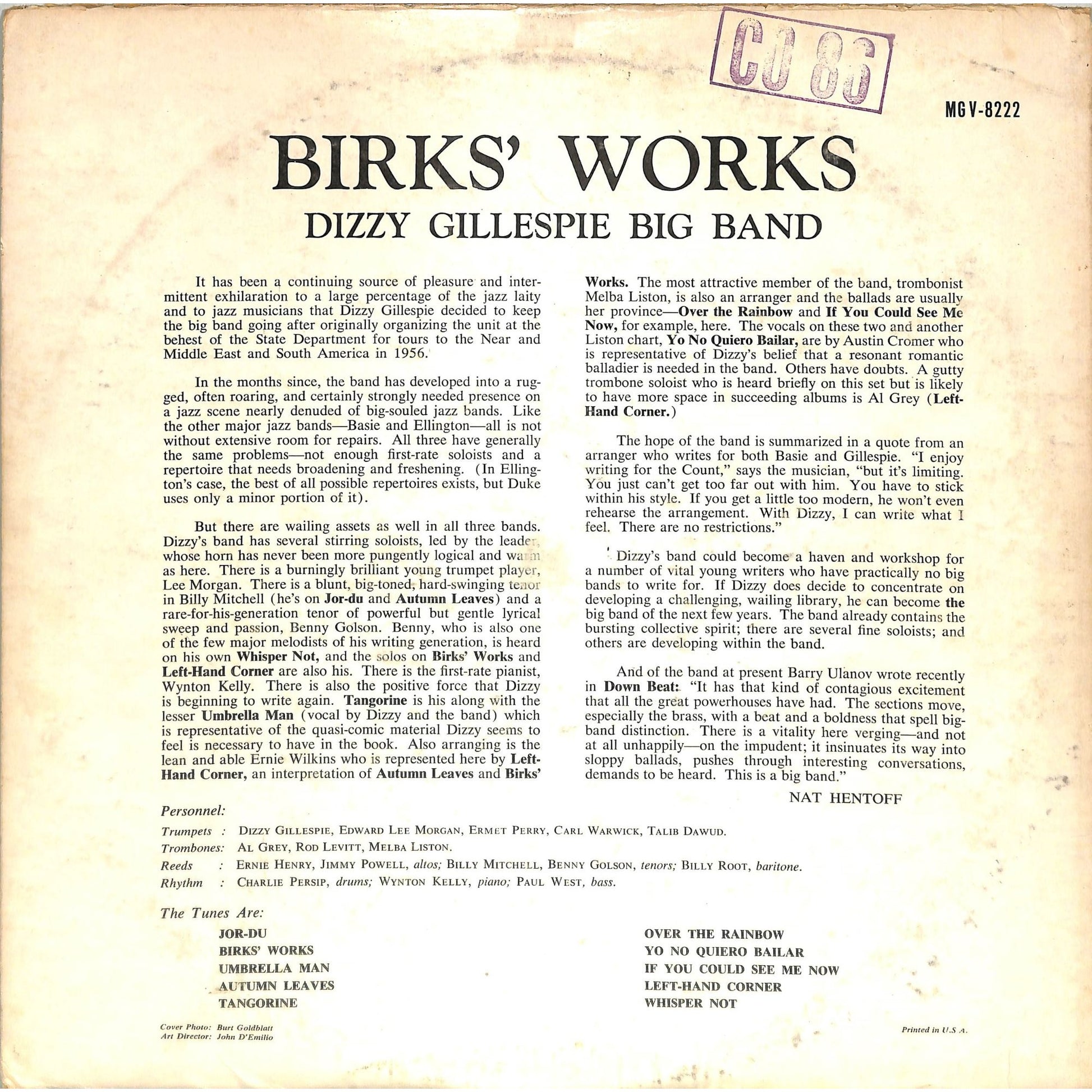 Birks' Works is a 1957 album by jazz trumpeter Dizzy Gillespie, compiling recordings from his time with Verve Records. The album highlights Gillespie’s signature bebop style while also showcasing his big band arrangements and Afro-Cuban influences. Featuring a mix of studio and live tracks, it includes standout performances of the title track along with compositions that display his virtuosic trumpet playing and innovative approach to rhythm and harmony. The album serves as a strong representation of Gillespie’s mid-century output and his role in shaping modern jazz.