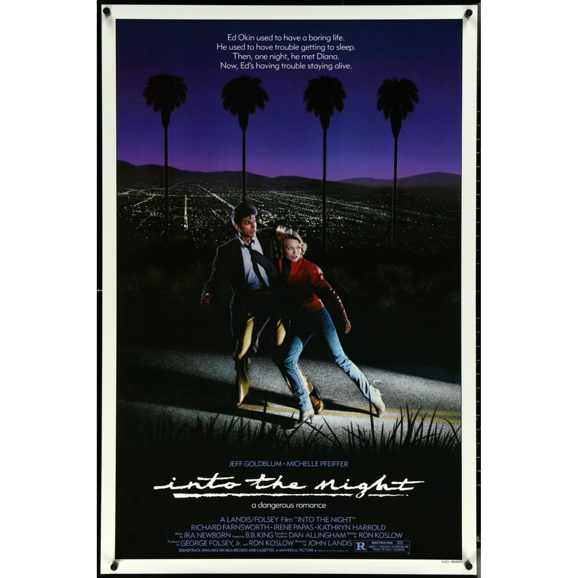 "Into the Night" is a 1985 American action-comedy film directed by John Landis. The movie follows Ed Okin, played by Jeff Goldblum, an insomniac aerospace engineer who inadvertently gets involved in a wild adventure when he encounters Diana, a mysterious woman portrayed by Michelle Pfeiffer, being chased by a group of international jewel thieves. The film features an ensemble cast, including notable appearances by Dan Aykroyd, David Bowie, and Richard Farnsworth, with numerous cameos by various filmmakers and celebrities. The film combines elements of thriller and comedy, set against the backdrop of nocturnal Los Angeles.