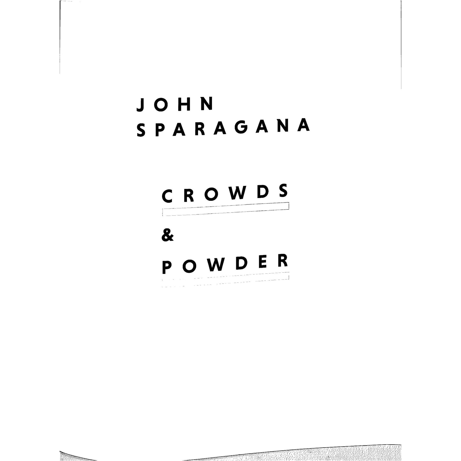 John Sparagana's 'Crowds & Powder' art catalog is a printed compilation of his artistic works. The catalog features discrete textual design, starting with a minimalist title page. It offers critical insight into the artist's focus on themes like crowds and his experimental methodology with powder. Likely contains photographs, illustrations, or descriptions relating to Sparagana's unique artistic practices.