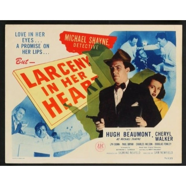*Larceny in Her Heart* (1946) is a low-budget crime mystery directed by Sam Newfield, featuring Hugh Beaumont as private detective Michael Shayne. Hired to locate a missing woman, Shayne stumbles into a case involving murder, deception, and a mental institution hiding dark secrets. Part of the long-running Michael Shayne series, the film delivers fast-paced pulp-style thrills with a wisecracking hero navigating a maze of femme fatales and criminal intrigue.