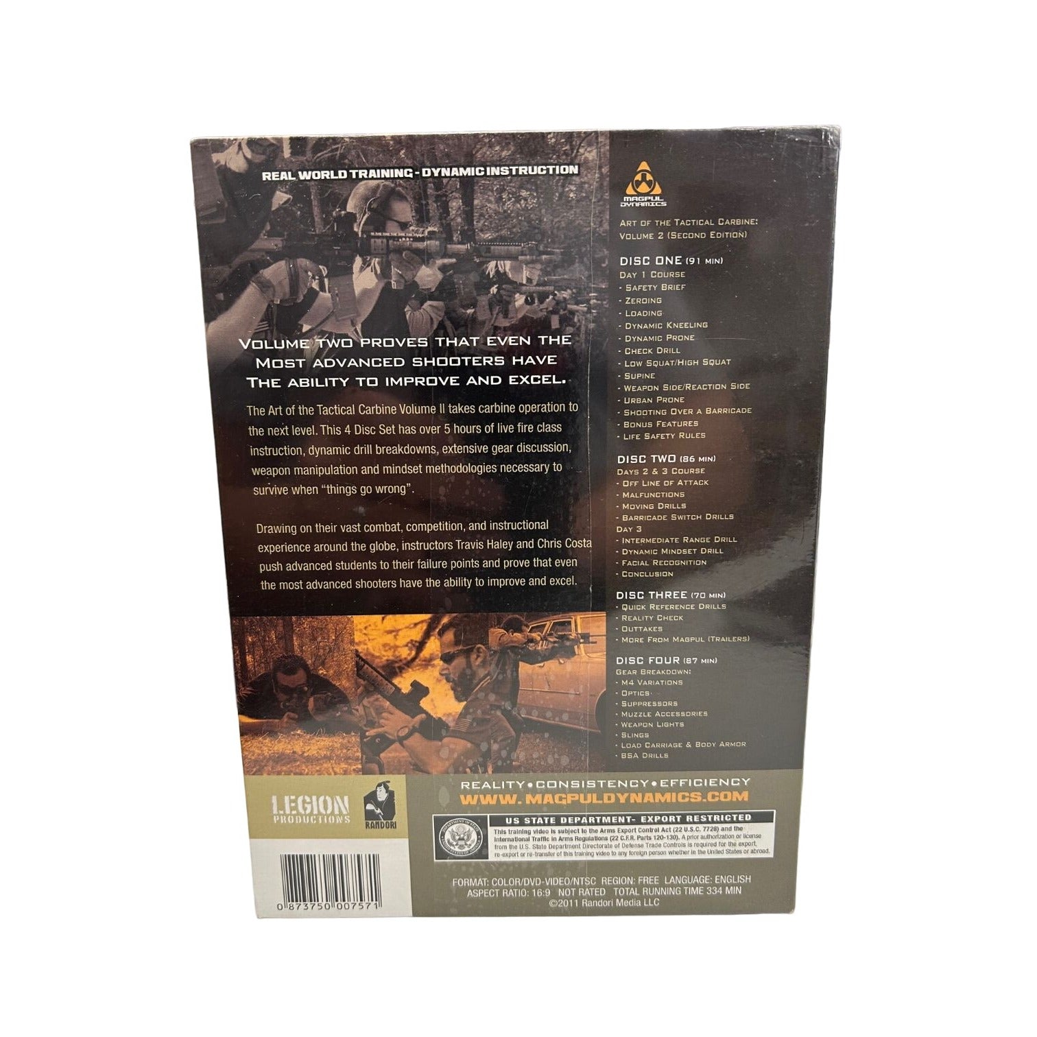 Magpul Dynamics: The Art Of The Tactical Carbine Vol. II 2nd Ed - 4 DVD Set NEW Four discs, DVD-Video/NTSC, Total Running Time 334 min. 4-Disc DVD set featuring over five hours of actual live fire class instruction and additional instructional material Instructors Travis Haley and Chris Costa present an informative and exhilarating Dynamic Carbine class that focuses on pushing your failure points and finding the perfect balance between speed and accuracy Using real advanced shooters from the firearms industry, law enforcement SWAT, and military special operations, this DVD set will show that no matter what level of the game you're in you always have the ability to excel Made in USA BRAND NEW SEALED