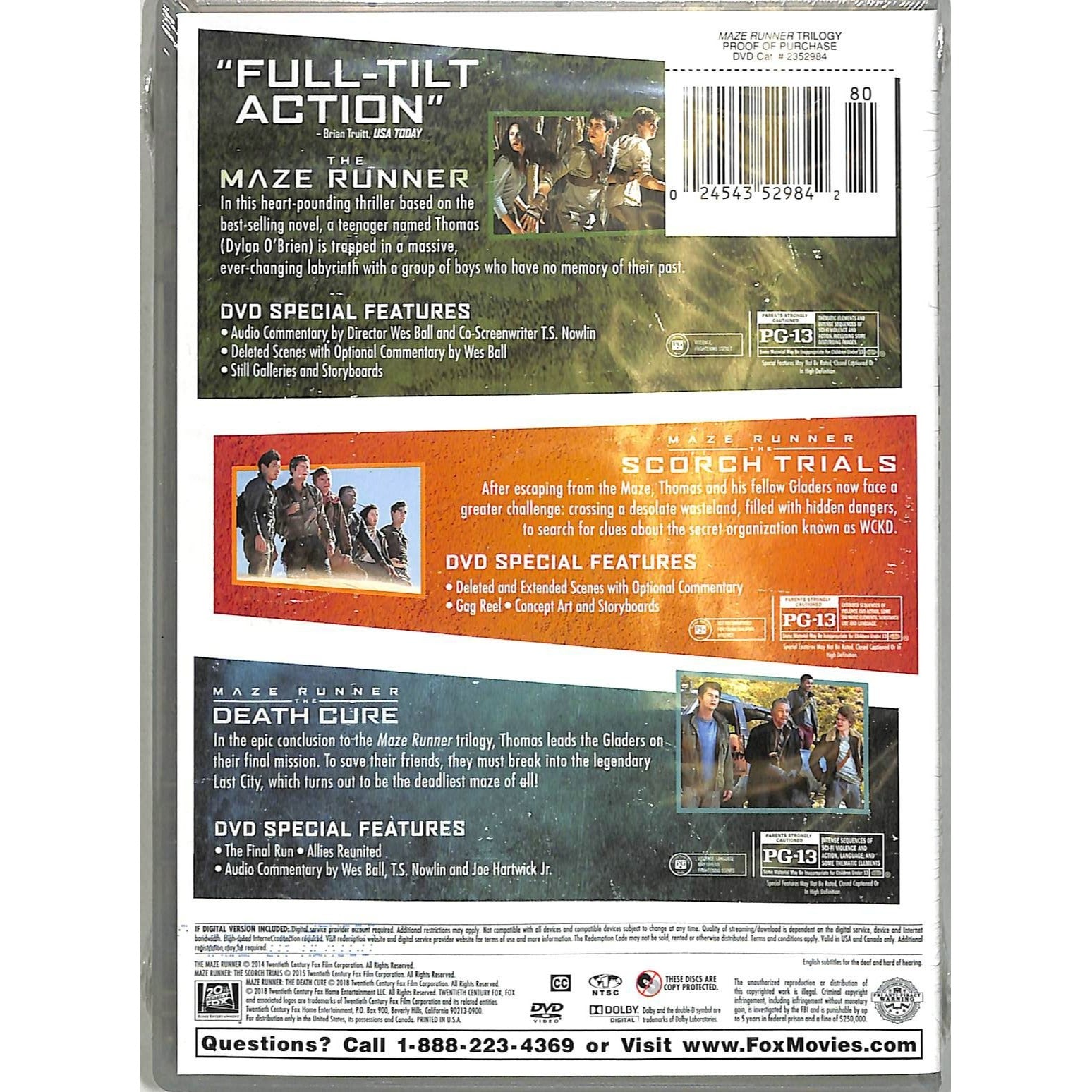 Maze Runner Trilogy (3-DVD set, UPC 024543529842) — a complete collection of all three films in one convenient package. This officially licensed Fox release brings together The Maze Runner, The Scorch Trials, and The Death Cure with crisp transfers and bonus features. Add this blockbuster sci-fi adventure set to your shelf — perfect for fans or collectors alike!