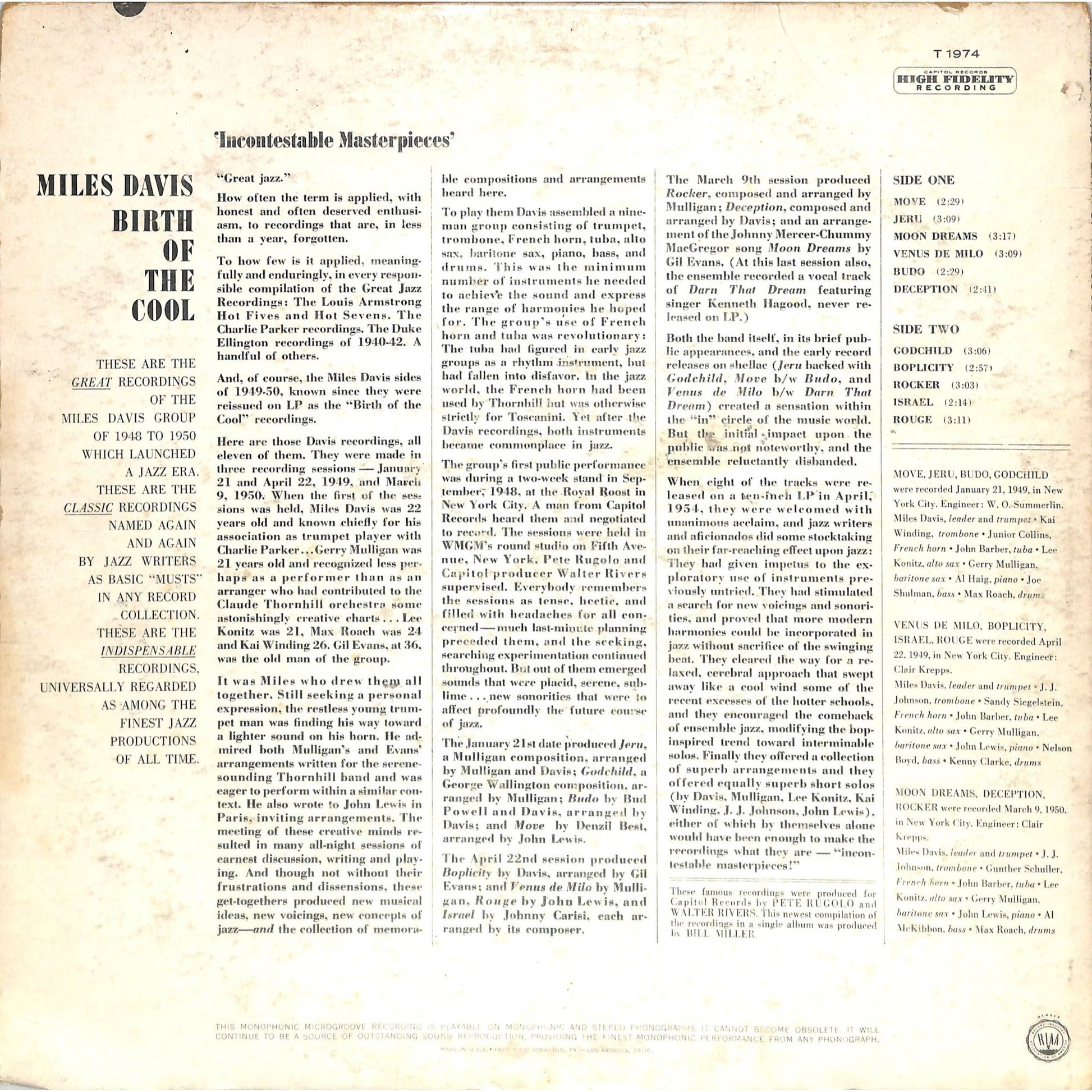 Miles Davis - Birth of the Cool (1963) Vinyl Record T 1974