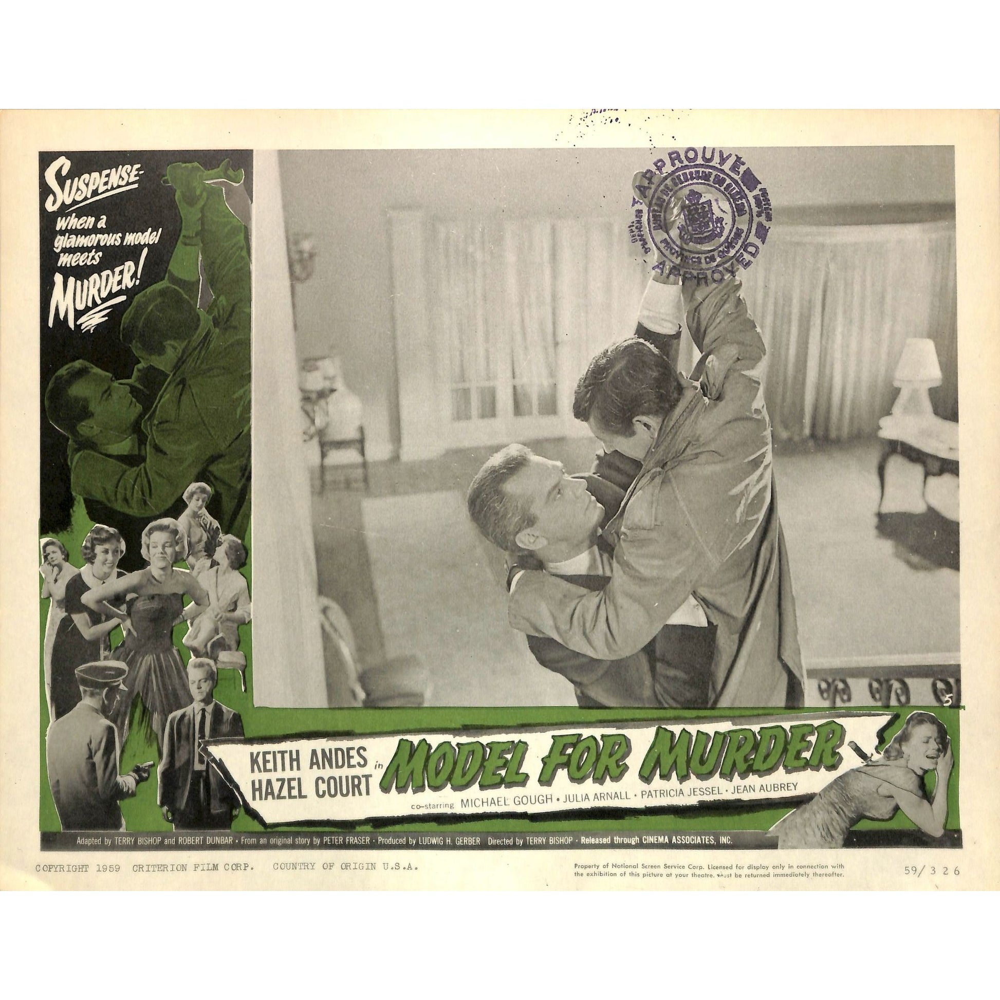 This is a complete original U.S. lobby card set for Model for Murder, a 1959 British crime thriller directed by Terry Bishop and starring Keith Andes, Hazel Court, and Jean Aubrey. The set consists of eight full-color 11x14 lobby cards, each capturing stylish scenes from this moody murder mystery. The imagery includes suspenseful stills of the fashion world colliding with crime, featuring glamorous models, tense confrontations, and noir-lit interiors.