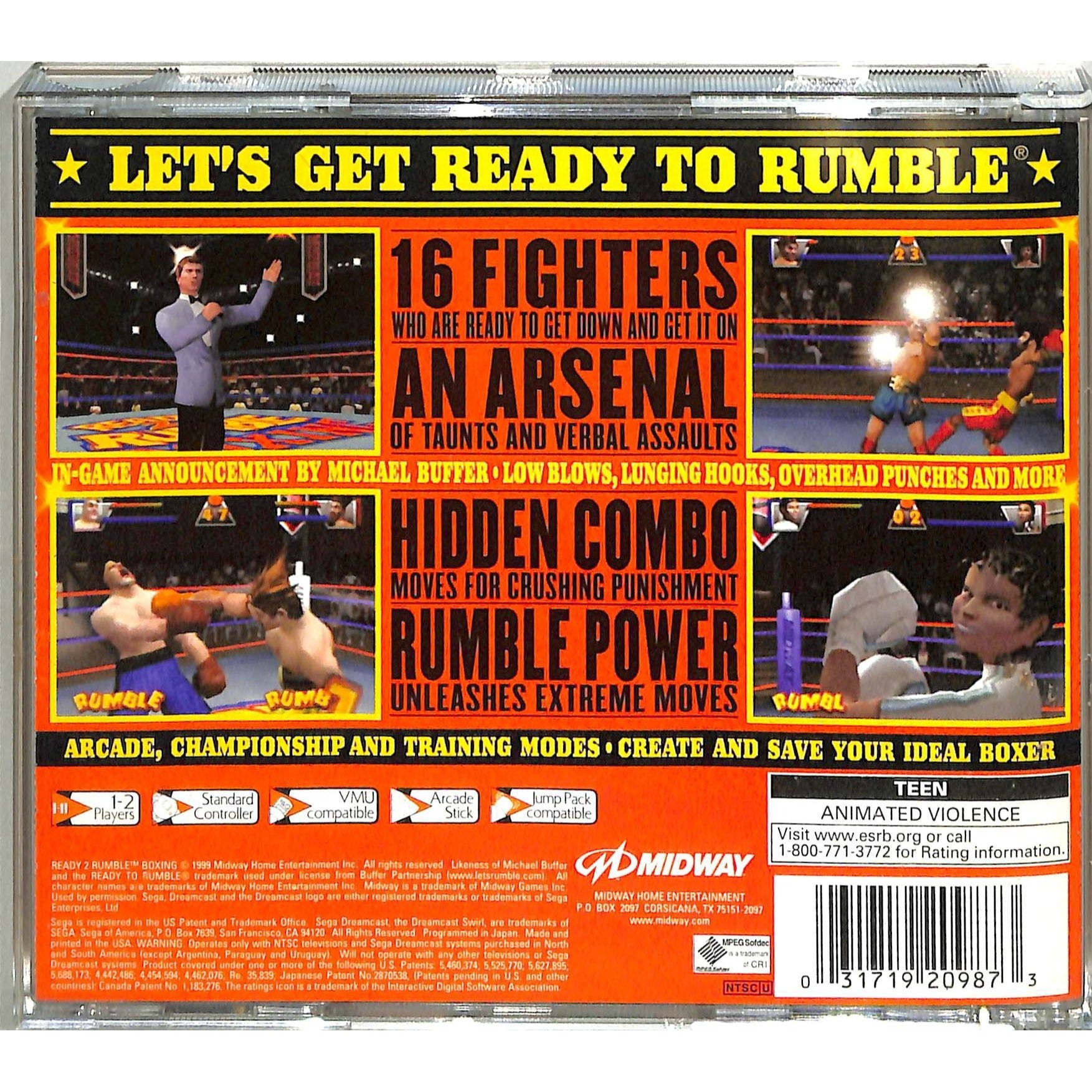 Ready 2 Rumble Boxing is a 1999 Dreamcast fighting game developed by Midway Games. The game features over-the-top, arcade-style boxing with exaggerated characters and fast-paced action. Players can choose from a variety of colorful boxers, each with their own unique moves and personality, and battle in different boxing rings. The gameplay combines simple controls with power-ups, allowing players to perform special "rumble" moves and knockout punches. Ready 2 Rumble Boxing is known for its fun, cartoonish graphics, humorous commentary, and accessible gameplay, making it a hit for both casual players and fans of boxing games. The Dreamcast version also featured enhanced graphics and smoother gameplay compared to its predecessor on the Nintendo 64.