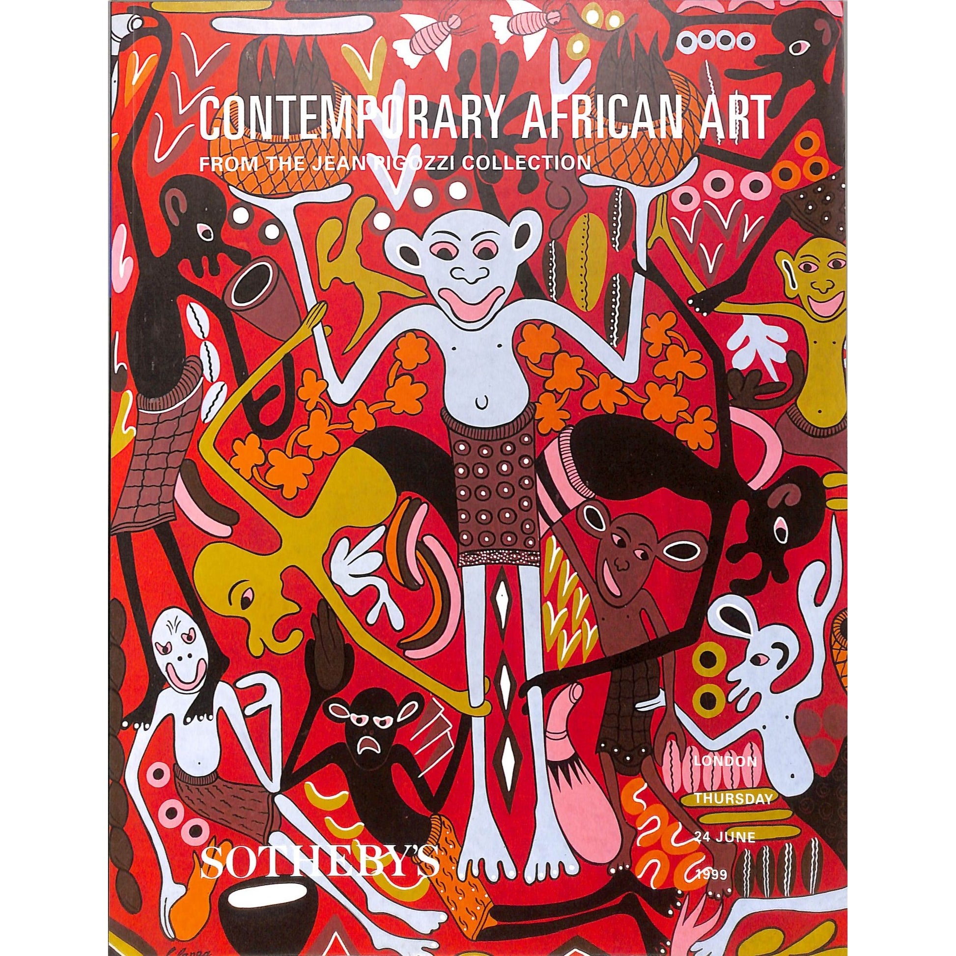 Sotheby’s Contemporary African Art auction catalog from June 24, 1999. This catalog features works from the Jean Pigozzi Collection of African art. The cover includes colorful artwork, while the back displays a historical photograph. Includes detailed artwork listings, artist information, and auction details.