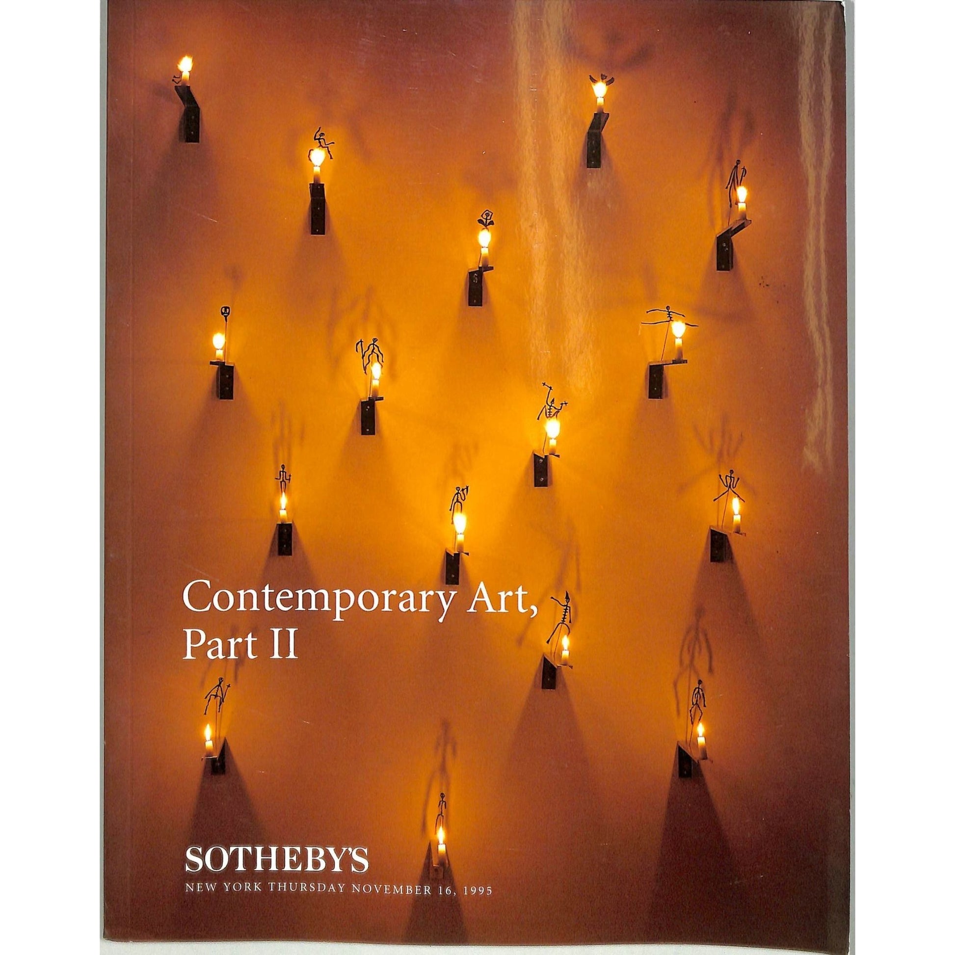 Sotheby's Contemporary Art Auction Catalog, Part II, from November 16, 1995. Includes detailed listings of artworks and artists featured in the auction. Features color and black-and-white illustrations of the artworks along with descriptive text. Published by Sotheby's, founded in 1744, this catalog serves as a historical reference for contemporary art collectors and enthusiasts.
