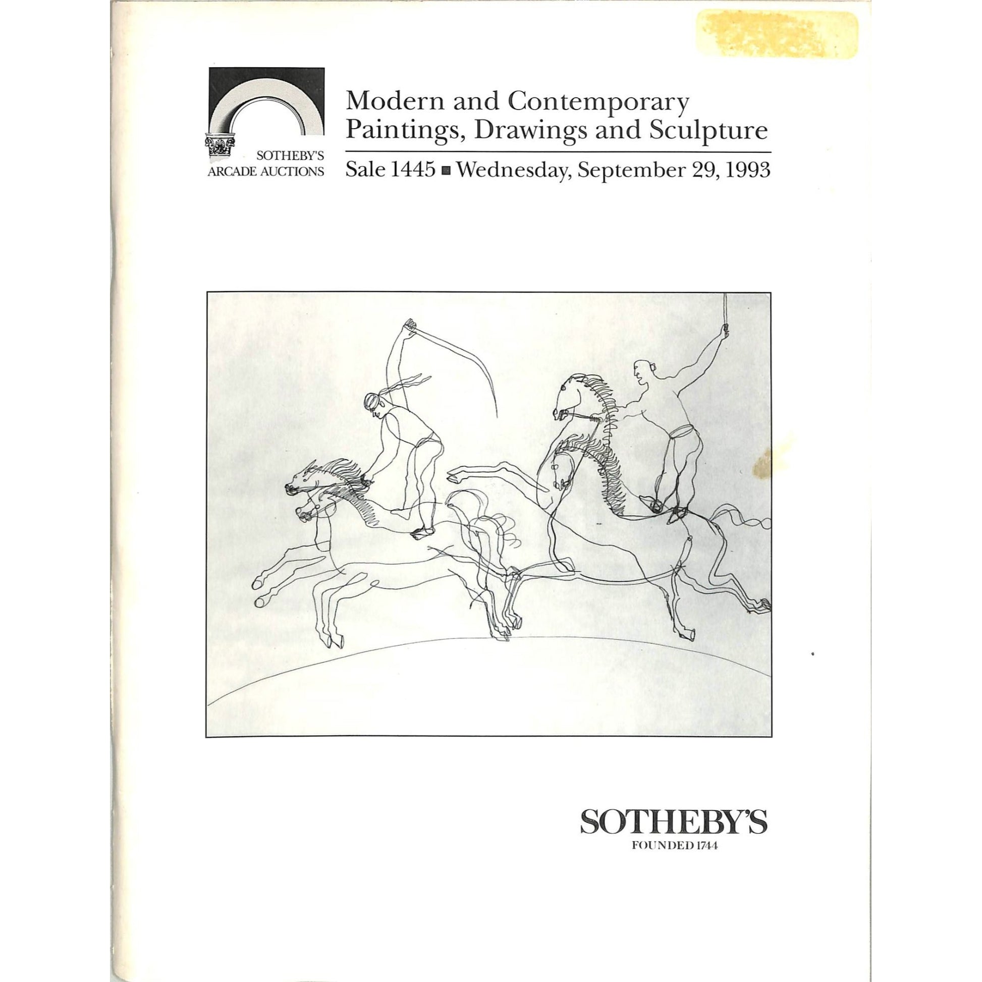 Sotheby’s auction catalog for Modern and Contemporary Paintings, Drawings, and Sculpture, held on Wednesday, September 29, 1993, Sale 1445. Includes information about the sale and upcoming Sotheby’s auctions. The catalog features illustrated works and details relevant to the auction items. Some signs of wear commensurate with age.