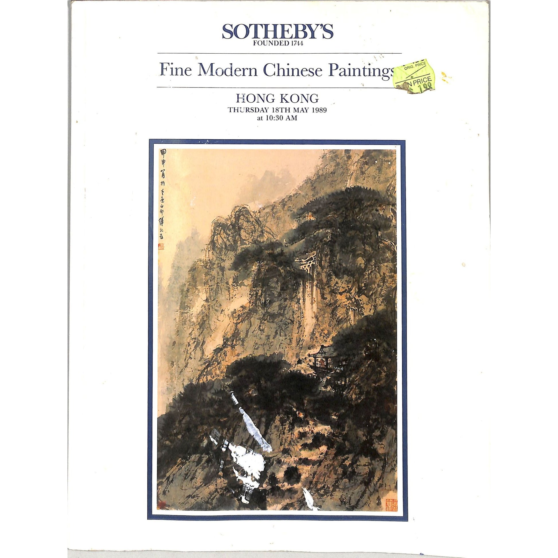 Sotheby’s Fine Modern Chinese Paintings Auction Catalog, dated May 18, 1989, from an auction in Hong Kong. The front cover features an illustrated artwork and the Sotheby’s branding. The back cover displays the Sotheby’s logo. The catalog likely includes detailed information about the artworks offered in the auction. Condition: visible wear on the cover, including discoloration and a price sticker.