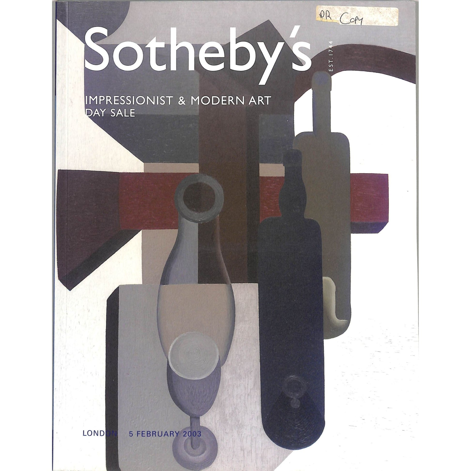 Sotheby’s auction catalog for the Impressionist and Modern Art Day Sale held on February 5, 2003, in London, New Bond Street. The catalog features details on artworks presented during the sale, with full-color images and descriptions. Includes 196 pages. Condition appears to be good with some signs of wear typical for a used catalog.