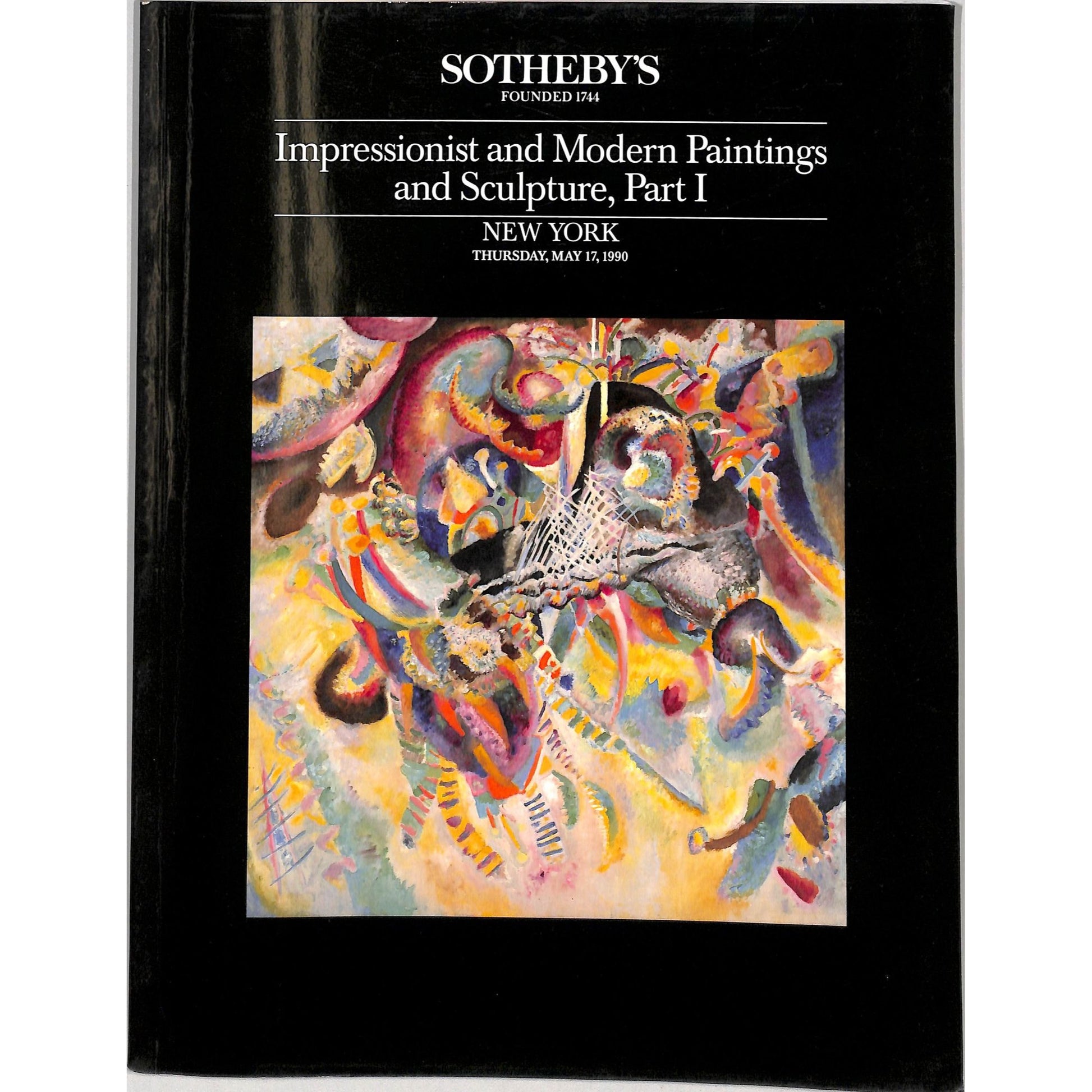 Sotheby’s auction catalog for 'Impressionist and Modern Paintings and Sculpture, Part I,' held in New York on May 17, 1990. Features color illustrations, detailed lot descriptions, and auction details. A glossy softcover publication with a vibrant cover design. Suitable for collectors and art history enthusiasts.