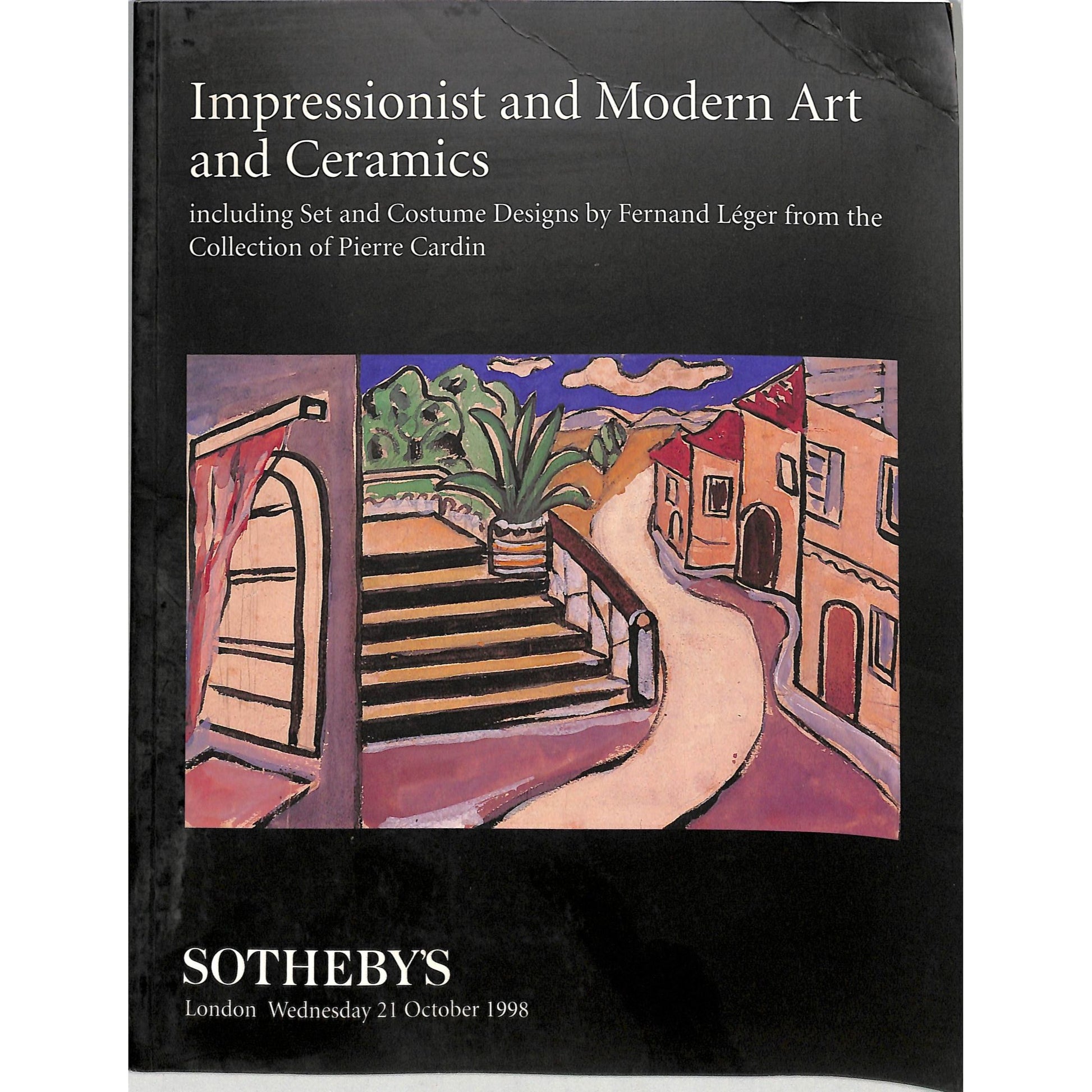 Sotheby's Impressionist and Modern Art Auction Catalog, held on October 21, 1998, in London. The catalog includes auction details for artwork and ceramics, with a focus on set and costume designs by Fernand Leger from the collection of Pierre Cardin. It is an essential resource for collectors and enthusiasts. The condition appears to be good with visible wear.