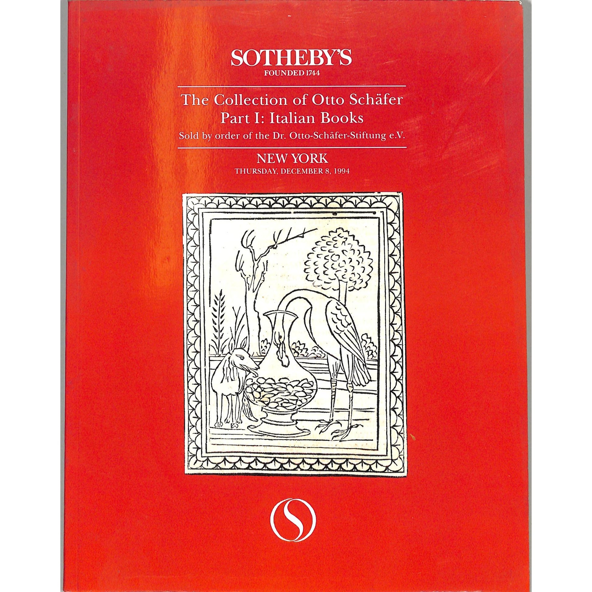 Sotheby's auction catalog for the Otto Schafer Art Collection, Part I: Italian Books, held on December 8, 1994 in New York. Features a detailed inventory of items and illustrations on 87 pages. The catalog is bound with a red cover and includes expert commentary. Sold by order of Dr. Otto Schafer-Stiftung e.V.