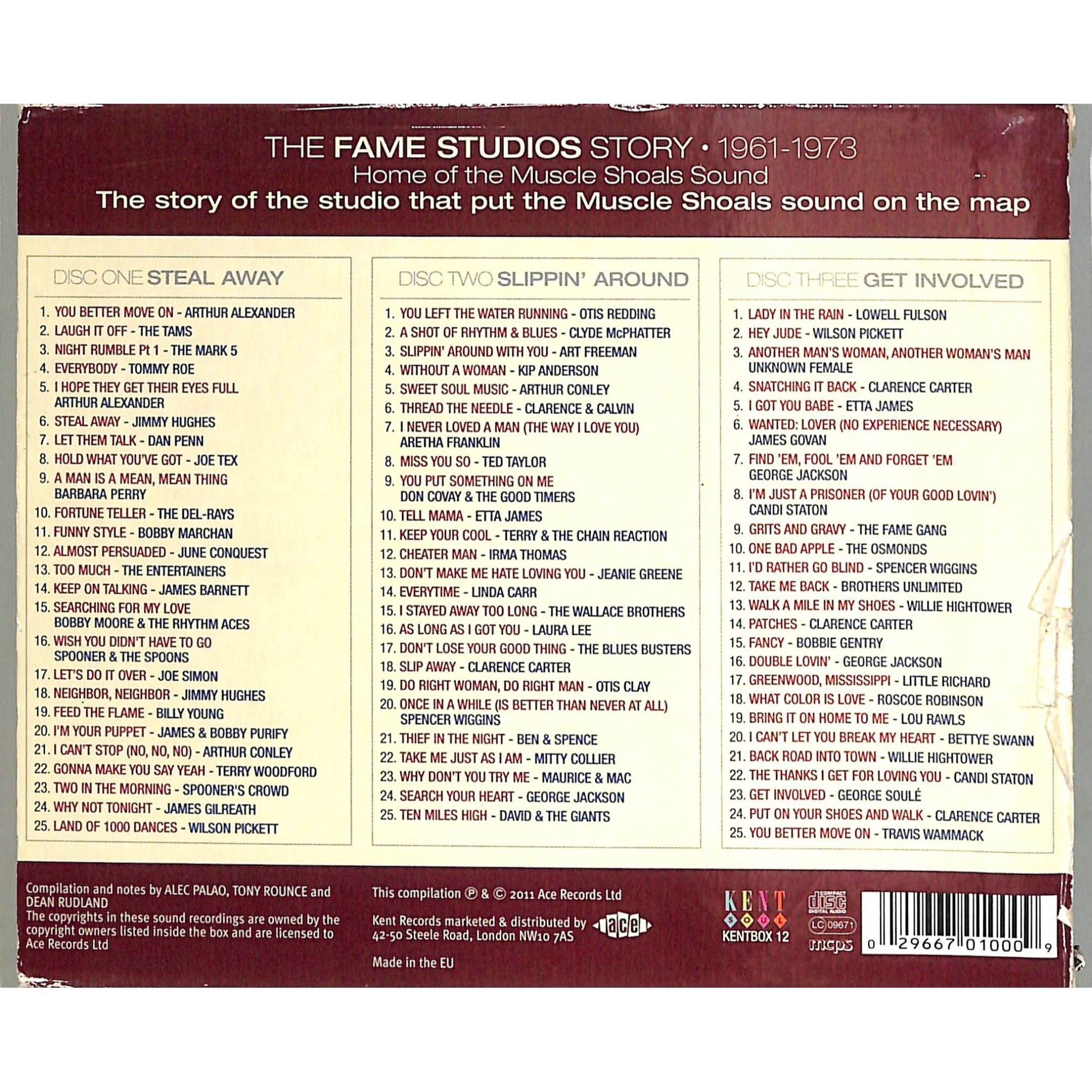 The FAME Studios Story: 1961–1973 is a 3-CD compilation released by Ace Records in 2011 that highlights the most influential years of FAME Recording Studios in Muscle Shoals, Alabama. Spanning 75 tracks, the set features a mix of soul, R\&B, and Southern pop recorded under producer Rick Hall, with performances by artists such as Aretha Franklin, Otis Redding, Etta James, Wilson Pickett, Clarence Carter, and Candi Staton. It captures the studio’s signature sound—gritty, emotional, and tightly arranged—driven by its legendary house band later known as The Swampers. Alongside major hits are deep cuts and rare recordings that showcase the full scope of FAME’s musical legacy during its peak. The compilation also includes detailed liner notes and rare photos, offering a comprehensive look at one of the most important studios in American music history.