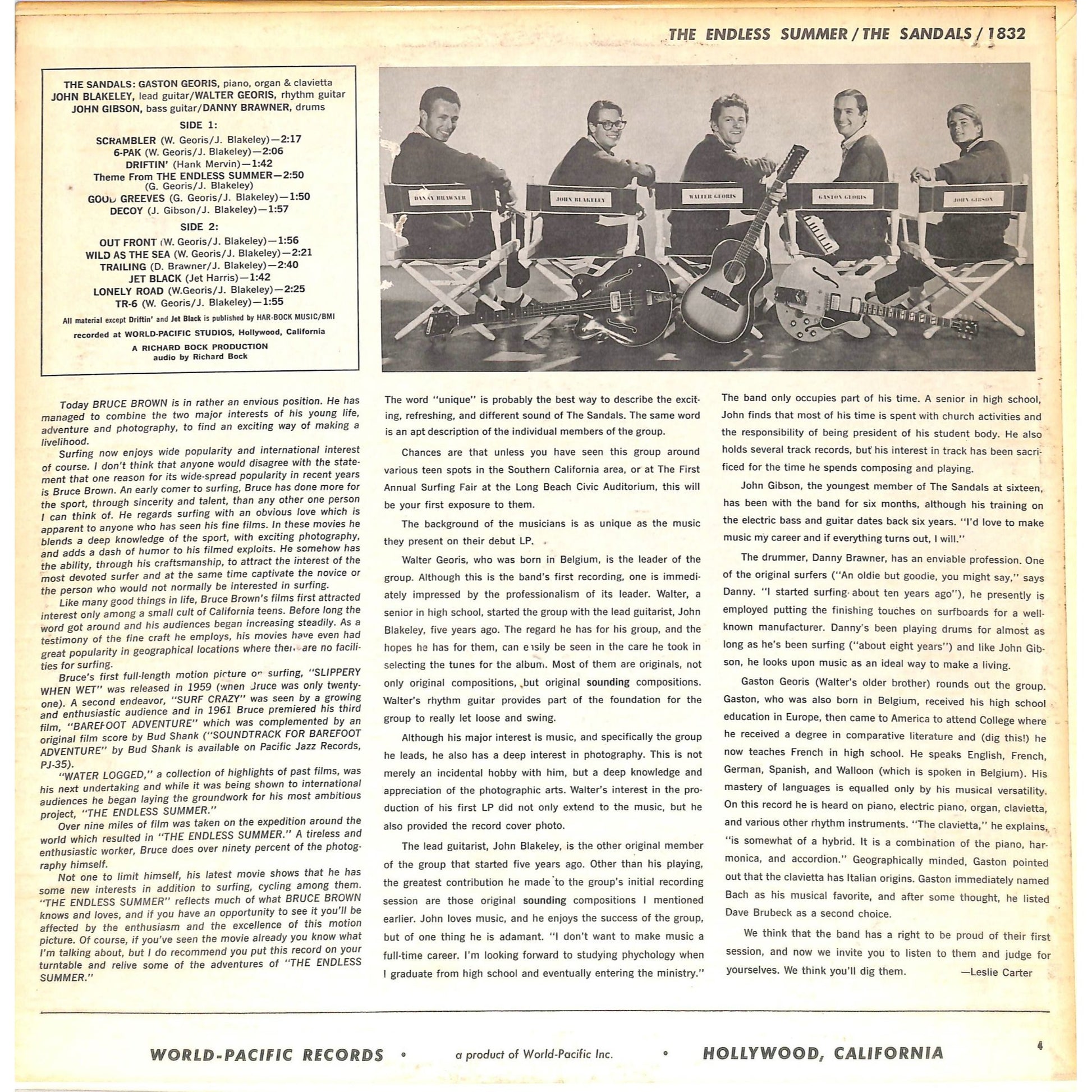 "The Endless Summer" is a 1966 album by the American surf rock band The Sandals, known for being the soundtrack to the 1966 film of the same name. The album is instrumental and captures the laid-back, sun-soaked vibe of surf culture with its smooth melodies and twangy guitar riffs. The Sandals' sound, characterized by upbeat rhythms and evocative, scenic atmospheres, became synonymous with the surf music genre. The album’s title track, along with other pieces like "Movin' and Groovin'," evokes the carefree spirit of surfing and beach life. Although not as commercially successful as some of the more famous surf bands, "The Endless Summer" by The Sandals has remained a beloved classic among surf music enthusiasts.