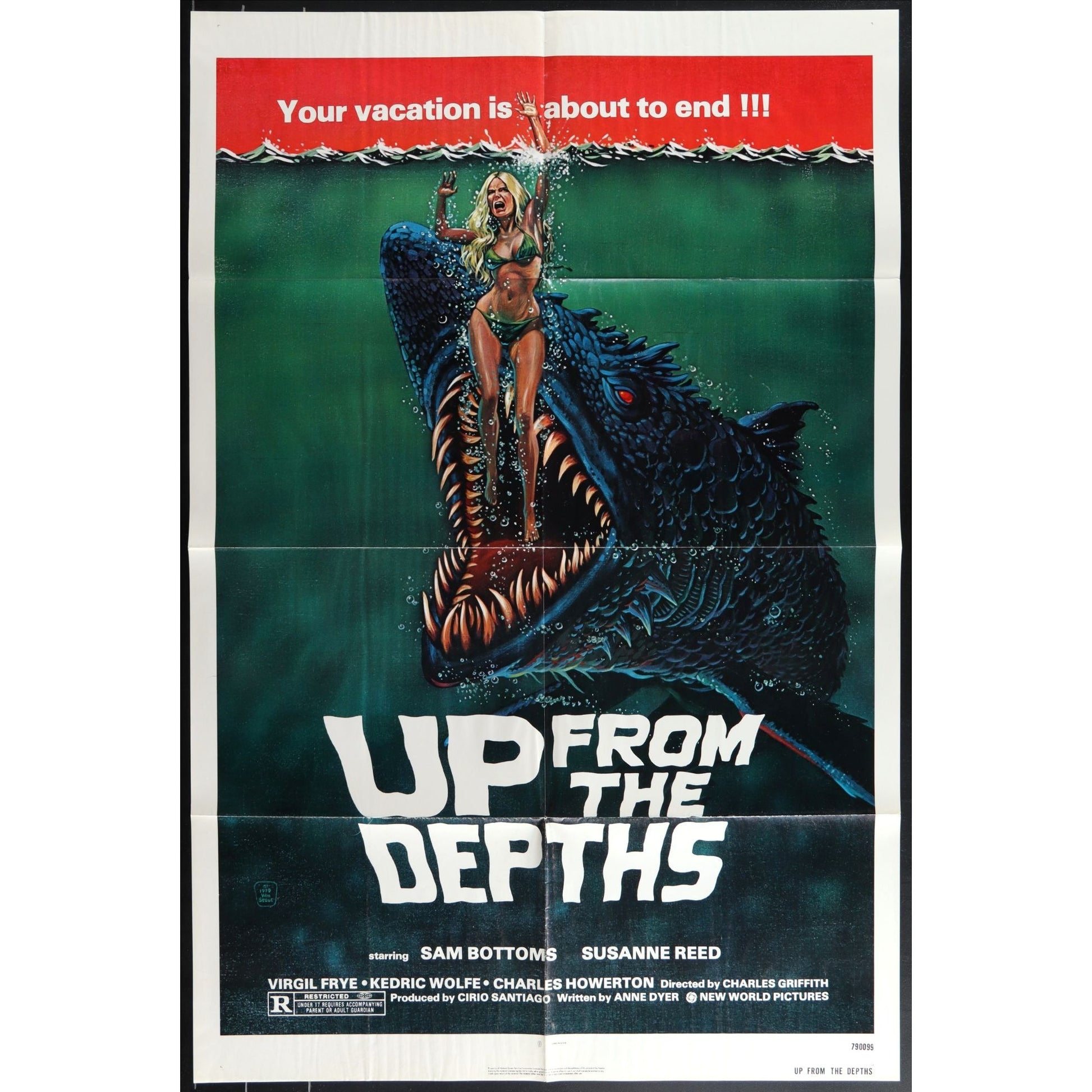 Up from the Depths (1979) is a B-movie horror film directed by Charles B. Griffith. The plot revolves around a large, aggressive sea creature that terrorizes a tropical island, attacking both locals and tourists. As the monster wreaks havoc, the islanders must work together to survive the bloodthirsty creature, resulting in a mix of creature feature horror and action with a distinctly campy vibe.